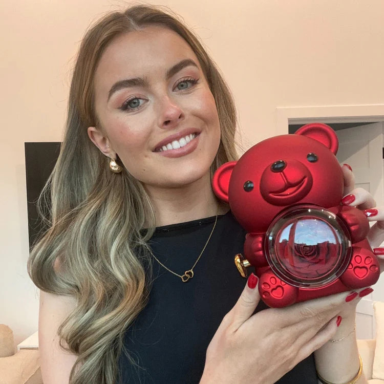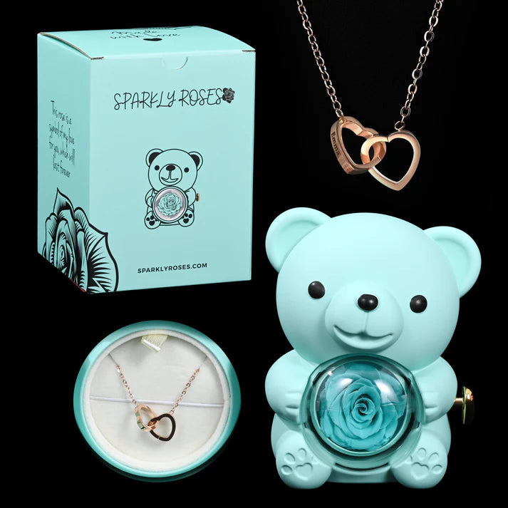 Our eternal rose bear with a hidden personalized necklace is a gift that lasts a lifetime. Featuring a real preserved rose that will last forever, this gift is the perfect symbol of eternal love.Rotate the rose to reveal a handmade 316L stainless steel necklace, plated with genuine 18k Gold, and personalized with engravings of your choice, free of charge.